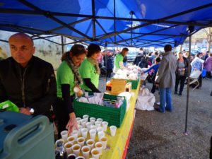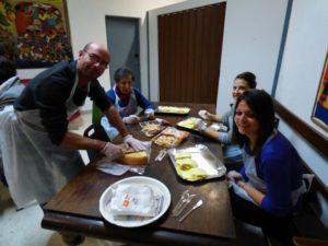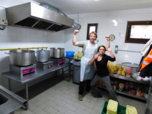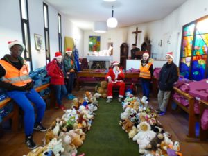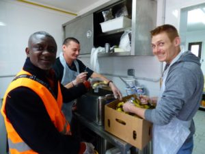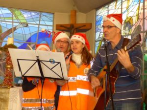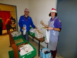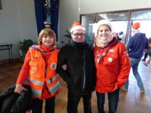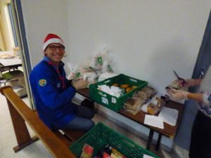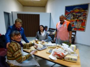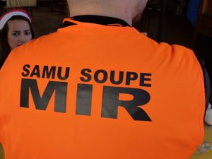 Certains d’entre nous aidaient « en haut » à la distribution des cadeaux, d’autres en « bas » à la préparation de la soupe, des sandwichs et des sacs repas pour la maraude (l’association MIR sert le repas à 300 SDF dans les rues de Nice tous les samedi et lundi soirs).