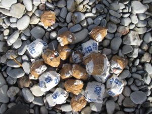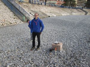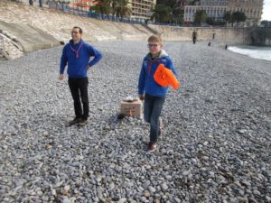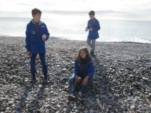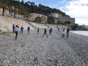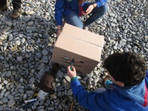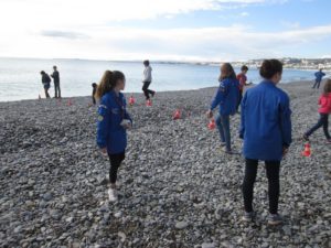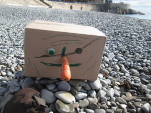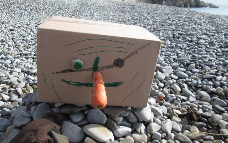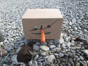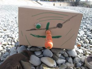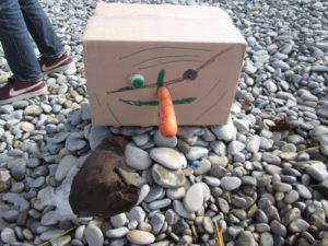 Ensuite nous sommes allés à la plage pour faire un jeu censé se jouer dans la neige mais qui s’est donc fait dans les galets ! Nous avons dû construire un bonhomme de galets, de carton et avec un nez carotte et se lancer des boules de journal.
