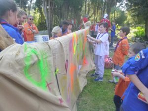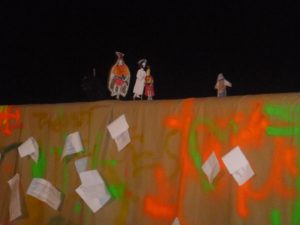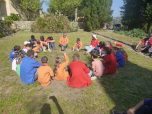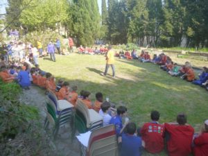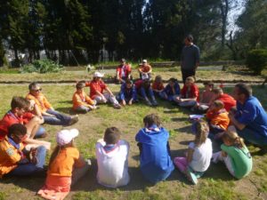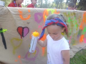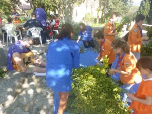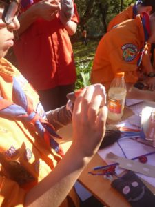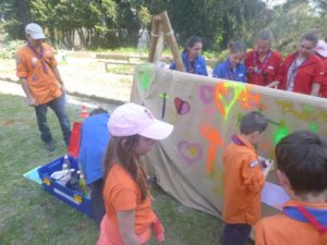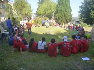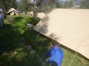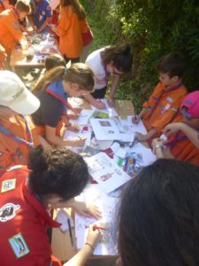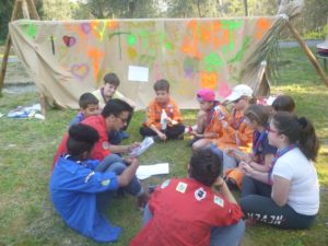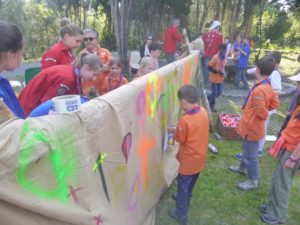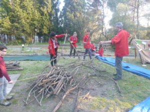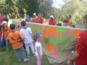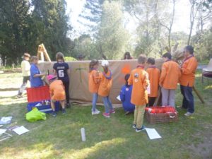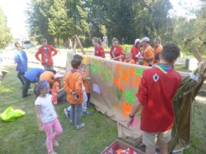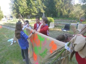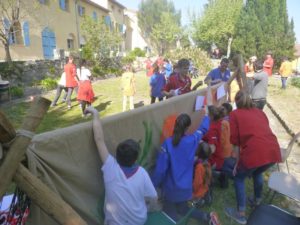 Vers 13h -14h, nous sommes arrivés à l’Arche. Nous nous sommes installés (monter les tentes). Puis nous avons commencé les activités : nous étions séparés en 4 groupes. Chaque groupe dans une activité (rameaux, créations de marionnettes, préparation d’un spectacle de marionnettes, peinture sur toile).