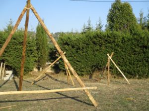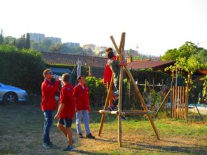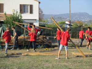 Le week-end du 14 et 15 octobre, nous nous sommes réunis au local pio en la présence d’Arnaud (qui a reçu une formation de froissartage) pour nous entrainer au froissartage (construction avec du bois et de la corde). Grâce à ses conseils, chaque équipe a pu se lancer dans une construction durable. Certaines équipes ont commencé à réaliser des trépieds (pour faire la base de tables) et d’autres ont voulu essayer le mi-bois (méthode qui consiste à creuser le bois et à l’emboiter pour faire des constructions sans corde).